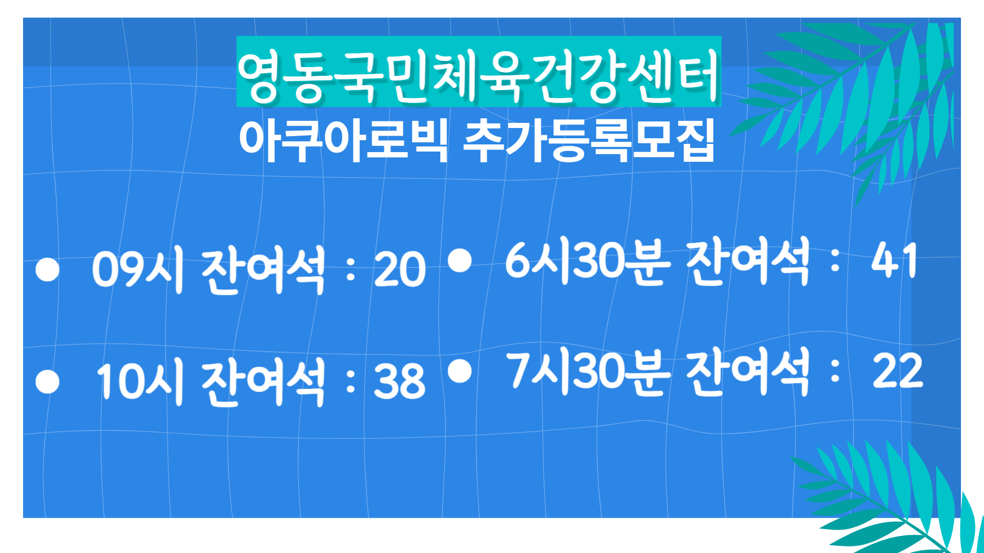 Program 아쿠아로빅 홈 · 운영 프로그램· 아쿠아로빅 3월 아쿠아로빅 일정 📱 표 전체를 보려면 화면을 좌우로 스크롤하세요 수강 시간 강습 요일 수업명 비고 06:00~06:50 화, 목(주2회) 아쿠아로빅 ※ 한 타임 강습 인원은 최대 60명입니다. ※ 아쿠아로빅 수업 중 일부레인 자유수영 가능 ※ 모든 강습은 한 타임 50분 수업 ※ 한달 강습료 50,000원 ※ 결제 시 추가 개인정보동의서 작성 필요 07:00~07:50 화, 목(주2회) 아쿠아로빅 09:00~09:50 화, 목(주2회) 아쿠아로빅 10:00~11:00 화, 목(주2회) 아쿠아로빅 18:30~19:20 화, 목(주2회) 아쿠아로빅 19:30~20:20 화, 목(주2회) 아쿠아로빅 아쿠아로빅 강습 시작일: 4월 2일(목)아쿠아로빅 신규등록 3월25일(수) ~ 3월 27일(금)아쿠아로빅 추가등록 : 4월 1일(수) ~ 4월 3일(금)